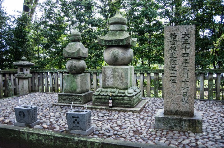 墓所の入り口である唐門をくぐると、右手に「毛利輝元荼毘の地」があります。この石塔は、供養塔ではなく、かつてお堂の屋根に乗っていたものだそうです。参道には数十mに渡って敷石が敷かれ、両側に石灯籠が建てられています。先に進んで行くと、竹林に囲まれた静かな場所に五輪塔の墓があります。右側の大きい方が輝元、左側がその夫人の墓です。