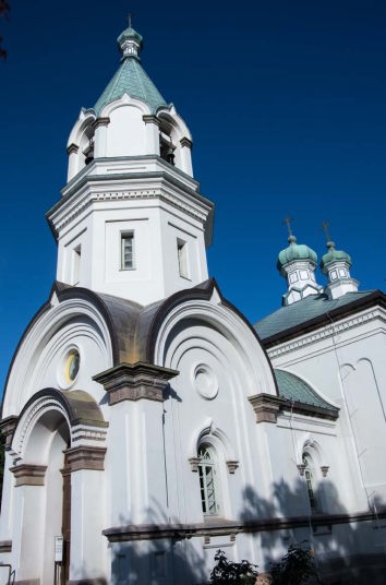 現在の聖堂は、白漆喰(しっくい)壁と銅板の緑の屋根の対比が美しく、ロシア風ビザンチン様式の建物です。屋上には、冠型をした小塔(クーボルト)が6基あり、それぞれに十字架が添えられています。正面玄関上には八角形の鐘塔があり、5代目となる鐘が据えられています。毎週土曜日の午後5時(徹夜祷;てつやとう:正教会の奉神礼)、日曜日の午前(聖体礼;せいたいれい)に、3~5分鳴らされているそうです。この鐘の音は、平成8年(1996)に「日本の音風景100選(環境省)』に認定されました。なお、元町界隈には、聖ヨハネ教会、カトリック元町教会などもあります。