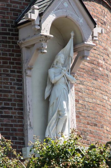 聖堂の壁に、旗と剣を持ったジャンヌ・ダルクの像があります。彼女は、14~15世紀に起こった百年戦争(英仏の戦い)で、フランス軍とともに戦い奇跡の勝利を演出しましたが、その後、不正な宗教裁判で処刑されました。死後、無実が判明されて名誉が回復され、聖女となりました。神と人々のために命をささげたジャンヌ・ダルクは、現在も修道女のシンボルとして敬われています。