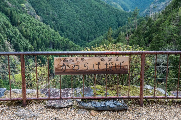 境内の南西のはずれにある地蔵院の前の展望広場で、「かわらけ投げ」ができます。広場にある売店で売られている素焼きの皿(2枚100円:2015年4月)を、錦雲峡に向かって思い切り投げると、厄除けになるというものです。もともと、神護寺が発祥で、その後全国各地に広まっていったのだそうです。