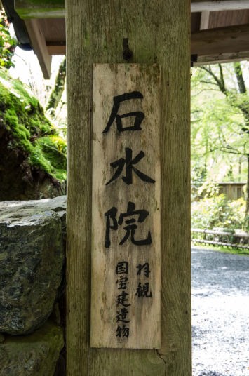 高山寺へは、京都駅からですと、JRバス高雄京北線に乗り、「栂尾」で降ります。駐車場・バス停から境内に入る道は裏参道です。車やバスで訪れる場合はここを通ります。苔に覆われた石垣と草木の中をつづら折にのぼっていきます。一木一草をそのままに、手を入れすぎない自然の美しさがここにはあるといいます。石段を登り切ると、石積みの上に低い白壁が続きます。その壁の向こうが石水院です。