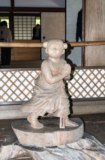 石水院の西正面は、かつて春日・住吉明神の拝殿であったところで、正面には神殿構の板扉が残っています。欄間に富岡鉄斎筆「石水院」の横額がかかっています。鉄斎は明治期の住職土宜法龍(どき ほうりゅう)と親交があり、最晩年は高山寺をよく訪れたといいます。落板敷(おちいたじき:一段低く下がった床)の中央に、善財童子(ぜんざいどうじ)像が置かれています。華厳経に現れる童子で、法を求めて53人の善知識(指導者)をたずねて教えを請い、最後に普賢菩薩のところで悟りをひらいたといわれる善財童子を明恵は敬愛し、住房には善財五十五善知識の絵を掛け、善財童子の木像を置いたといいます。