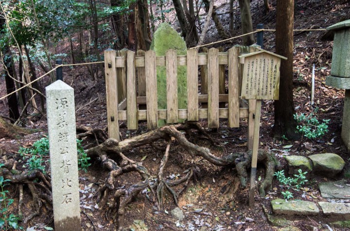 「息つぎの水」から山道を道なりに10分ほど歩くと「源義経公背比石」と彫られた石碑のある場所に着きます。柵の中に石が置かれています。この石は牛若丸が16歳の時、藤原氏を頼って奥州に旅立つ時に背比べをしたと伝えられている石で、牛若丸の背はこの石と同じ高さだったといいます。 この石の高さは決して高くはないので、牛若丸は案外小柄だったということになります。この場所で標高485mになります。