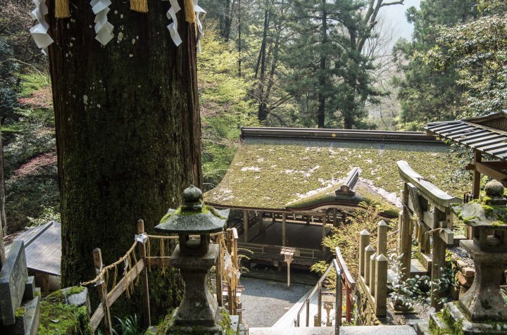仁王門から九十九折の坂道を10分ほど歩いたところに由岐神社があります。天災や平将門の乱などで政情不安だった天慶3年(940)、朱雀天皇が御所に祀られていた由岐大祭神を鞍馬に遷すことを決めました。この遷座の行列は、道中にかがり火をたき、鴨川の葦で作った松明をもって、神道具を先頭に約1kmに及ぶものだったといいます。この模様を後世に伝えようと始まったのが、毎年10月22日に行われる「鞍馬の火祭」(京都三大奇祭の一つ)です。由岐神社は、天慶3年(940)、鞍馬寺が御所から鎮守社として勧請(かんじょう)したのが始まりとされます。矢を入れて背に追う靫(ゆぎ)を祀り、世の平穏を祈っています。由岐神社の祭神は、大己貴命(おおなむちのみこと:大国主命、国譲りの神、出雲大社祭神)、少彦名命(すくなびこなのみこと:大国主命の命により国造りに参加した神)です。現在見る拝殿は、慶長12年(1607)に豊臣秀頼が再建したものです。拝殿の中央を通路にした割拝殿(わりはいでん)と呼ばれる形式のものです。この拝殿をくぐると、「願かけ杉」とよばれる樹齢600あるいは800年といわれる大杉が立っています。
