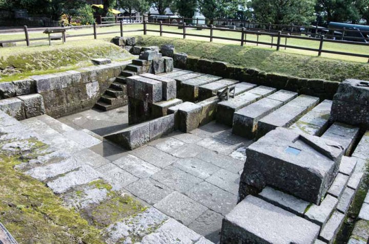 園の入り口から入って、まず目に飛び込んでくるのが鉄製の「150ポンド砲(150ポンド≒68㎏の砲弾を装着できる)」です。大人一人の体重に匹敵する砲弾を発射するのですから、かなり巨大です。そしてその奥に、この大砲の砲身を製造するための「反射炉跡」の石垣が見えます。反射炉とは、砲身の型に流し込むために、鉄を高温で溶融する炉です。幕末の藩主・島津斉彬が、外国の侵略に備えるために、富国強兵政策の一環として建造しました。石垣にある階段から上へあがると、炉床の下部構造を見ることができます。すのこ状に配置された石組は、風通しを良くして、湿気が炉内にたまり鉄が酸化することを防ぐための工夫です。また、灰落としのために石組みが傾斜しており、その上にロストル(火床)があり木炭や石炭といった燃料を燃やしていました。