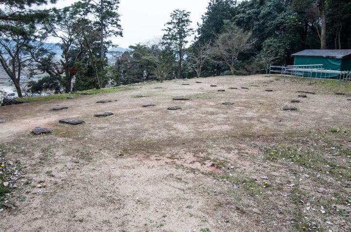 尾根道と呼ばれる石段を登りきると、黒金門跡に出ます。黒金門は、安土城中枢部(本丸、二の丸、三の丸、天守)への主要な入り口の一つです。平成5年(1993)の発掘調査により、天守とともに黒金門も火災に遭ったことが明らかになりました。この一帯は、標高180mに達します。黒金門跡を通って城内に入り、左側に高い石垣を見ながら石段を上ると正面が二の丸跡、さらに右に進むと本丸跡に出ます。昭和16年と平成11年の二度の発掘調査により、本丸跡で119個の碁盤目状に配列された礎石が発掘され、それらの礎石には火災によるとみられる焼損の跡がありました。また、礎石の配列状態から、この建物は中庭を挟んだ3棟構成であり、天皇の日常の居所である清涼殿(せいりょうでん)とよく似た構成であることが判りました。実現はしませんでしたが、天皇の安土城行幸計画のために信長がわざわざ造営した御殿だったのかもしれません。