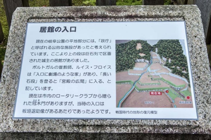 また、岐阜公園のあたりは、、信長時代の「政庁」と呼ばれる公的施設があった地域と考えられていて、ロープウェイの乗り場近くの高台には城主(信長)の居館があったといわれます。現在建物は残っていませんが、巨石列の区画の跡や、庭園にひかれたと見られる水路や石垣の跡を見ることができます(2017年4月に訪れたときは、発掘調査の最中でシートで覆われていました)。このページの先頭に戻ります
