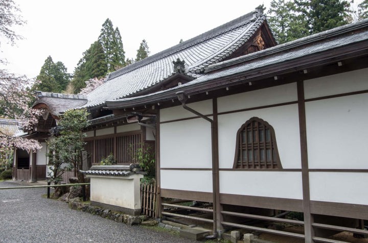 御殿門をくぐって、客殿玄関から建物の中に入ります。客殿は、平安時代には龍禅院と呼ばれ、大原寺の政所だったといいます。現在見る建物は天正年間(1573~92)の建立とされ、豊臣秀吉により、禁裏修復の際の紫宸殿(ししんでん)の余材を使用して修築されたといいます。客殿前の庭園は、聚碧園(しゅうへきえん)と呼ばれます。江戸時代の茶人、金森宗和(かなもりそうわ)が修築した池泉観賞式庭園です。聚碧園とは、緑(碧)が集(聚)まる地という意味だそうです。庭内の池の水の源は、音無しの滝から流れ出た清流・律川です。杉木立の間からは、往生極楽院を臨むことが出来ます。シャクナゲやツツジ、また楓などの植栽があります。