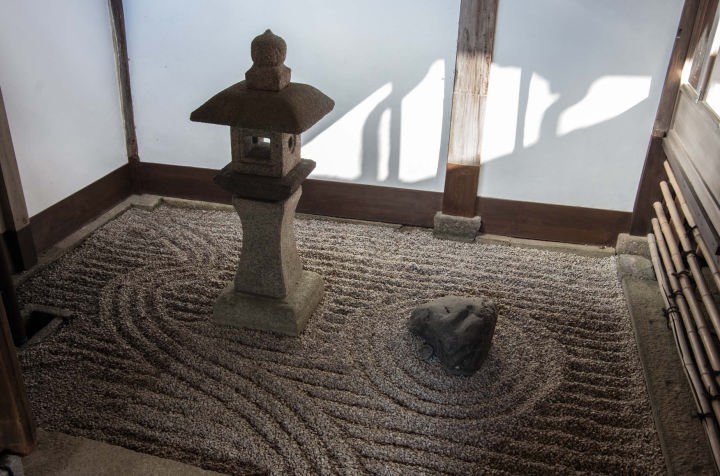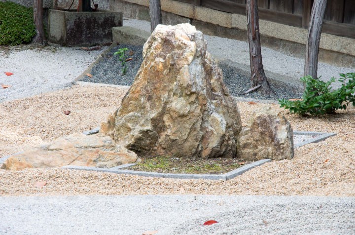 本堂を出て渡り廊下を進むと書院に着きます。書院の仏間には、正面に親鸞上人像、向かって左に阿弥陀如来立像、右に不空羂索観音(ふくうけんさくかんのん)像が祀られています。親鸞聖人は、真如堂の阿弥陀如来をあつく信仰していて、比叡山から六角堂(京にある聖徳太子創建の寺)へ参詣する際には、真如堂を参拝していたといわれます。書院には、二つの庭があります。一つは、「涅槃の庭」です。枯山水(かれさんすい)の庭で、昭和63年に曽根三郎氏によって作庭されました。その教えを広めるために各地をめぐっていた釈迦が、あるとき死期を悟って、生まれ故郷の北インド地方に向かいます。その途中のガンジス川支流の沙羅の林の中で入滅する姿をこの庭は表現しています。向かって左(北)を頭にした釈迦が右脇を下にして横たわり、その回りを弟子や生類たちが囲んで嘆き悲しんでいる様子が、石によって表現されています。また、白砂はガンジス川を、ヒノキなどは沙羅の林を表しています。もう一つの庭は、「隨縁(ずいえん)の庭」です。平成22年に重森千靑(ちさお)氏によって作庭されました。背後にある仏堂の蟇股(かえるまた)にある「四つ目の家紋」がモチーフとなってデザインされたといいます。「隨縁」とは、その縁によって物事はさまざまに変わっていき違う姿を見せるものだという意味で、この庭も、季節や朝夕の日の当たり方で様々な表情を見せてくれるのだそうです。