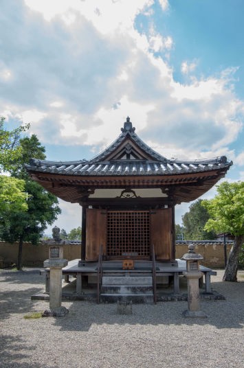 南門は、鎌倉時代後期の建立とされ、切妻造(きりつまづくり)、本瓦葺(ほんがわらぶき)の四脚門です。この南門をくぐると正面に本堂が見えます。現本堂の建物は、奈良時代の創建当時に建立された金堂以外の建物の転用とみられています。桁行(けたゆき:正面)7間(間は柱の間の数)、梁行(はりゆき:奥行き)5間、入母屋造(いりもやづくり)、本瓦葺の建物です。正面の中央3間を戸口とし、両側2間ずつには窓がなく白壁となっているのが印象的です。創建当時は、密教的修法を行う壇所であったという説があります。内部は土間になっており、太い柱が立ち、天井は屋根裏がない化粧屋根となっています。中央の円壇の中心には、新薬師寺本尊の木造薬師如来座像が安置されています。奈良時代~平安時代初期の作で、像高は約1.91mあります。頭と胴体などの体幹部分は一本のカヤの木から彫り出され、手と足は同じカヤの木から木目を合わせて寄木をしてつくられているそうです。光背(こうはい)の宝相華(ほうそうげ:牡丹や蓮、柘榴などの植物を部分的に取りいれた空想上の植物)の花の上には六体の小仏があり、本体と合わせて七仏薬師を表しているといいます。目は大きく見開いていて、穏やかで力強い印象を与えています。眉、瞳、髭などに墨、唇に朱を差すほかは彩色や金箔を施さない素木仕上げとなっています。昭和50年(1975)の調査で、像の体内から平安初期のものとみられる法華経8巻が見つかりました。