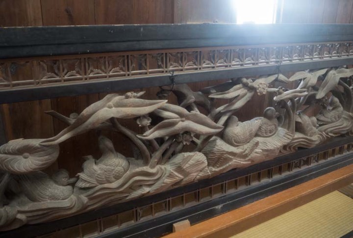 詰門への石段の手前を右に迂回して進むと、天守・御殿のある本丸に出ます。天守へは、本丸御殿(懐徳館〈かいとくかん〉)から入場料を払って入ります。本丸御殿は藩主の居館であり、御座所である上段の間、四ノ間、三ノ間、ニノ間、藩主を護衛する家来が隠れていた武者隠しなど、江戸中期の再建当時の姿がそのまま残されています。また納戸蔵には、江戸中期の土佐の名工・武市高朋(たけちたかとも:土佐の左甚五郎と呼ばれる)が彫ったという三の丸の欄間や、当時使用していた駕籠、船印として使われた山内家の三つ柏の家紋などが展示されています。