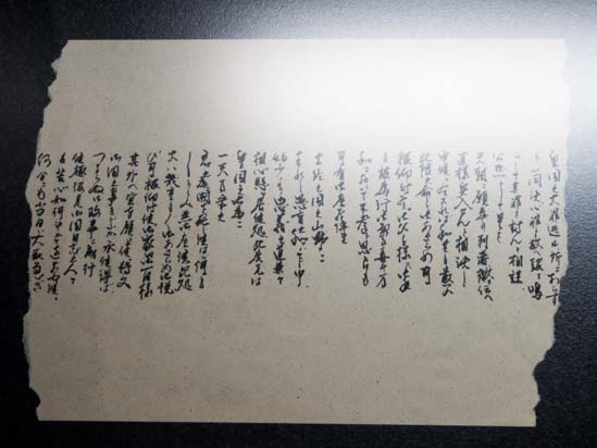 土佐藩同志に贈ったものです。ここで特筆すべきは、「自今以後天下を興さん者は必ず薩長両藩なる可し。吾思ふに天下近日の内に二藩の令に従ふこと、鏡に掛けて見るが如し。」として、新しい時代は、薩摩と長州が中心となると予見していることです。このころすでに慎太郎は、薩長融和の実現こそが最優先の課題だと確信していたと思われます。また慎太郎は、欧米の進んだ学問や兵学をしっかり学び、新生日本に取り入れるべきだと述べています。攘夷のための攘夷ではなく、欧米の進んだ技術を自分たちのものにし、経済力、軍事力を高めてこそ、本物の攘夷が実現できると考えていたのです。