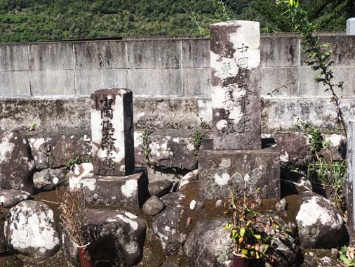 慎太郎館の前の広い道から右(南東方向)に入り、慎太郎館の東側に沿った狭い道を登っていくと松林寺跡にたどり着きます。この寺の境内に中岡家墓所があり、中岡慎太郎遺髪墓地があります。慎太郎の亡骸は、坂本龍馬と共に京都御霊護国神社(きょうとごりょうごこくじんじゃ)に葬られていますので、こちらは慎太郎の遺髪が納められた遺髪墓地となります。この墓所には、慎太郎の両親、妻・兼、義兄北川竹平次の墓もあります。松林寺は禅宗寺院で、慎太郎が子供時代、住職から読み書きを習っていたと伝えられます。松林寺は、度重なる火災のため、今は山門しか残っていません。
