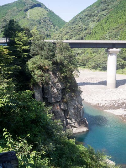 中岡慎太郎館からバス道路を奈半利駅方面に400~500mほど下ると、右手に奈半利(なはり)川を見下ろす展望所があります。巻の渕と呼ばれるこの展望所の眺望は素晴らしく、撮影スポットでもあります。この展望所の左手にある断崖は、子供のころの慎太郎の格好の遊び場でした。高さ20mもある断崖の頂上から身を躍らせて飛び込むさまは、大人たちをも驚嘆させ、慎太郎の肝の太さを示す逸話として語り継がれています。