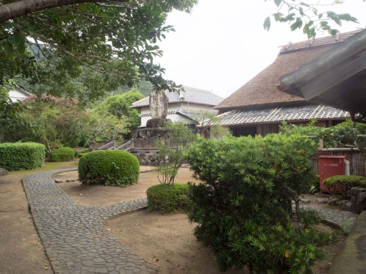 現存する生家は、弥太郎の曽祖父・弥次右衛門が郷士株を売ったお金で、寛政7年(1795)頃に建築したものといわれます。茅葺(かやぶき)の平屋で、建坪30坪ほどあり、風呂と便所が別棟になってます。母屋(おもや)の西側と奥に土蔵があります。この土蔵の鬼瓦には、「三階菱」の岩崎家の家紋がついています。これが現在の三菱グループのロゴマークの原型といわれています。また母屋の前の庭には、日本列島をかたどった石組があります。弥太郎が少年時代に自ら作ったものだといわれています。