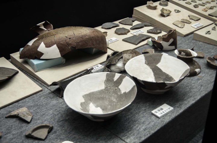 何度か行われた発掘調査により、二代基衡、三代秀衡の居館もこの地にあったとされています。大型の四面庇(ひさし)建物跡や、庭、広場、高床式倉庫、工房などの跡が見つかっています。また、大量の遺物も見つかっています。儀式や宴会で使用された使い捨て食器である「かわらけ」や、当時では最新の国産陶磁器であった渥美・常滑(とこなめ)窯製品(甕、壺、鉢)、中国製の白磁四耳壺(しじこ)などです。また、周囲には空堀が掘られており、清衡時代のものは幅6~7m、深さ約2mほどでしたが、秀衡時代にはこの空堀は埋められ、新たに幅12~14m、深さ約3.5mの大規模な堀が掘られています。秀衡時代に、何故大規模な堀に作りなおしたのかは興味深い謎です。この工事が行われた時期は、秀衡が鎮守府将軍(ちんじゅふしょうぐん:軍政府である鎮守府の長官)に就任した時期と重なるようです。