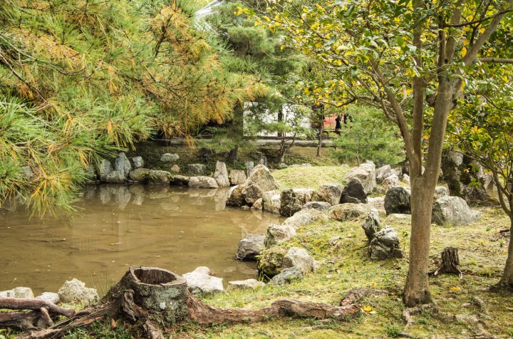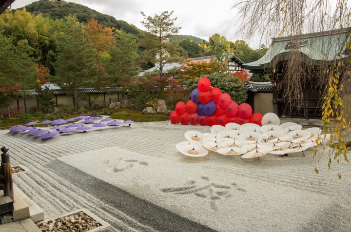 順路に従って、方丈に進みます。方丈は、創建当時は伏見城内の建物を移築したものでしたが、火災で焼失し、大正元年に再建されました。内部には、高台寺の本尊である釈迦如来座像が安置されています。また「豊国大明神」と書かれた秀吉の位牌と北政所の位牌が置かれています。方丈の前庭(南側)は白砂の庭で、山鹿傘に彩られていました(2014年11月)。また、庭の先には勅使門(ちょくしもん:大正元年再建)を臨むことが出来ます。方丈の東側には、偃月池(えんげつち)と臥龍池(がりょうち)を中心に作庭された池泉回遊式(ちせんかいゆうしき)庭園があります。小堀遠州作といわれ、桃山時代を代表する庭園といわれています。しだれ桜と萩の名所ともいわれます。偃月池には、書院と開山堂を結ぶ廊橋が架けられ(通行不可)、その途中に、観月台が設けられています。三方向に檜皮葺(ひわだぶき)の唐破風(からはふ)が付けられ、その屋根の下で月を眺めることが出来ます。北政所は、ここから亡き秀吉をしのびながら月を眺めていたといわれています。