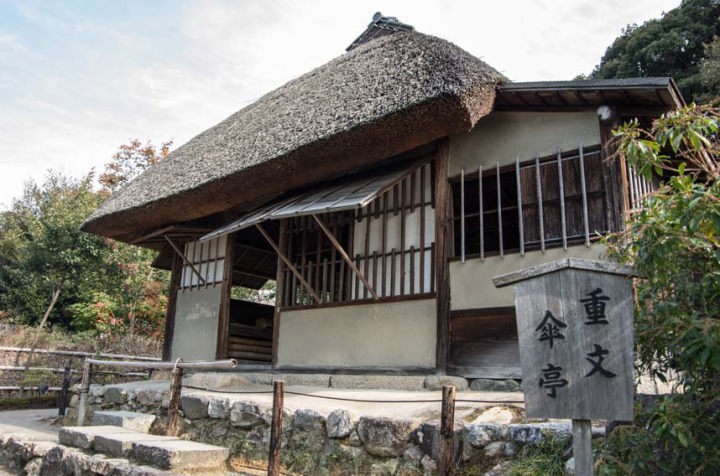 霊屋を東に少し登ったところに、傘亭と時雨亭という茶室があります。傘亭は、伏見城から移築したもので、千利休作といわれます。宝形造、茅葺(かやぶき)で、竹で組まれている内部の天井が唐傘に似ていることからこの名がつきました。時雨亭は、傘亭とは屋根つきの土間廊下でつながっています。茶室としては珍しい二階建てで、入母屋造です。これも千利休作といわれ伏見城からの移築です。ただし、伏見城建築は利休の切腹後なので真偽のほどは定かではありません。