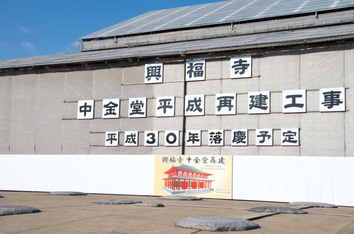 興福寺の金堂は三つあり、それぞれ中金堂(ちゅうこんどう)、東金堂(とうこんどう)、西金堂(さいこんどう)と呼ばれます。このうち西金堂は、天平6年(734)に、光明皇后が母・橘三千代の一周忌に際し、釈迦三尊を安置する堂として創建されました。しかし何度か火災に遭い、そのたびに再建されたのですが、享保2年(1717)の火災による焼失後は現在まで再建されていません。運慶作といわれる釈迦如来は、頭部のみ焼け残り国宝館に安置されています。中金堂は、寺の中心的な堂として、平城京遷都(710年)の直後に藤原不比等によって造営が始められ、和銅7年(714)に完成したとされます。堂内には本尊の丈六釈迦如来像、脇侍として十一面観音菩薩2体と薬王菩薩、薬上菩薩などが安置されていたといいます。しかし、この中金堂は7回も焼失再建を繰り返してきました。最後の享保2年(1717)の火災後は、しばらく再建されず、文政2年(1819)にようやく仮堂として復活しました。この仮堂も近年になって老朽化が激しくなり、昭和50年に旧講堂跡に新しく仮金堂が出来、現在に至っています。この建物は、薬師寺旧金堂を移築したもので、寄棟造(よせむねづくり)、本瓦葺の建物です。さらに現在、興福寺創建1,300年にあたって整備事業がすすめられ、創建当初の復元を目指し平成22年から中金堂の再建工事が始まっています。平成30年完成の予定だそうです。