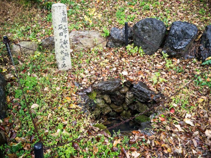 惣門の脇を通って境内に入ると、左(西側)奥に「石田三成水汲ノ池」があります。「三献の茶」の逸話の中で、三成が秀吉に茶を献じるために使った水汲みの井戸の跡だといわれます。