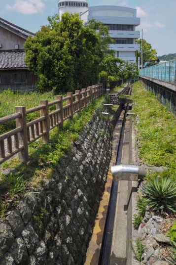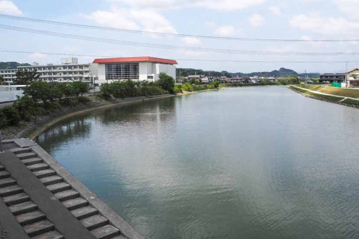 二の丸のマツとともに相良城の数少ない遺跡が「仙台河岸」です。仙台河岸は、牧之原市史料館から東に200mほど歩いたところにあります。町中を流れる萩間川(はぎまがわ)に架かる湊橋(みなと橋)の南西にあります。明和4年(1767)、田沼意次が相良城築城に取り掛かった際に、仙台藩主・伊達重村が寄進した石垣で作られました。当時は、城内と外海を結ぶ軍事上重要な船着き場だったようで、千石船(米千石を詰めるほどの大型帆船)なども横付けできたといわれます。現在残っているのは、その一部の石垣(約45mほど)です。